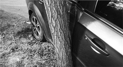 从前几张照片中,我们能看到雪佛兰轿车右侧有棵树,两车碰撞后紧紧粘合在一起。大家都知道力的作用是相互的,如果停止车辆被碰撞后,黑色SUV车辆也会受到相反的作用力,加之树对轿车的阻挡作用力会更明显,受到这些外力的作用,黑色车辆应当向后退。但现场两车粘合在一起,这一点也恰好说明碰撞后有人刻意动过黑色的SUV车辆。在双方驾驶员听勘查人员分析到这里时,就紧张地说不出话来,叙述事故经过也是有头没尾的;黑色的SUV车辆驾驶员甚至都提出自费修理车辆,但雪佛兰轿车驾驶员仍然坚持要保险公司承担修理费用。